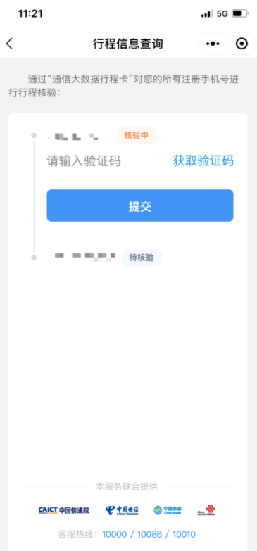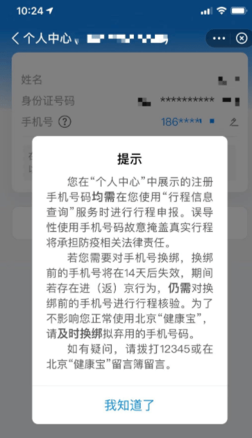 如果市民分别使用过微信端及支付宝端的北京“健康宝”小程序,并均授权绑定过手机号码,则行程申报时,所有手机号均需完成行程信息申报与核验,两端的手机号将都会显示在“个人中心”界面中。如果手机号已不再使用或非本人使用,将会无法顺利完成行程核验。