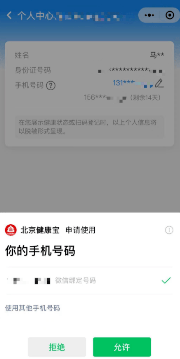微信端换绑手机号方法——在微信端北京“健康宝”的“个人中心”点击带有“编辑”图标的手机号码,界面中将出现手机号绑定弹窗。如果微信平台绑定手机号码是常用手机号,可直接点击“允许”;如果不是常用手机号,点击“使用其他手机号码”,添加常用手机号进行授权使用。